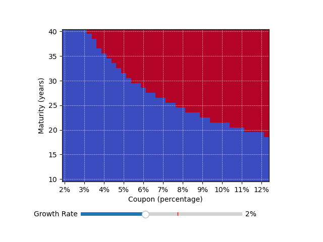 Below, I create a slideshow of graphs showing when we get a negative first principal payment for different maturities, coupon rates, and growth rates. The slider lets you change the growth rate assumption. I played around with 3D visualizations, but they were all much clunkier to interpret.